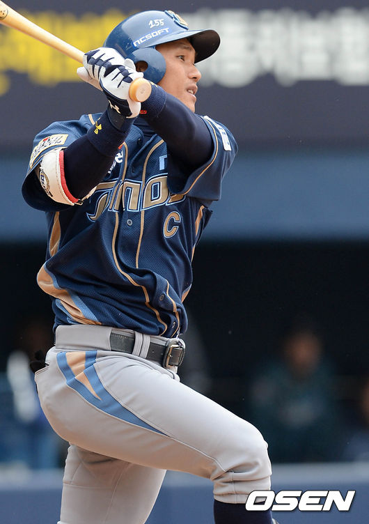 3회초 1사 주자 1,3루 NC 이종욱이 3루주자 김종호를 불러들이는 1타점 적시타를 치고 있다.