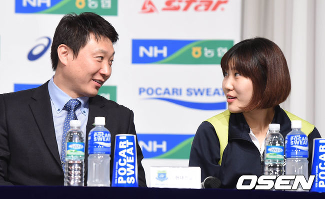 18일 오후 서울 청담동 호텔리베라에서 열린 NH농협 2014-2015 V-리그 포스트시즌 미디어데이에서 현대건설 양철호 감독과 염혜선이 이야기를 나누고 있다.