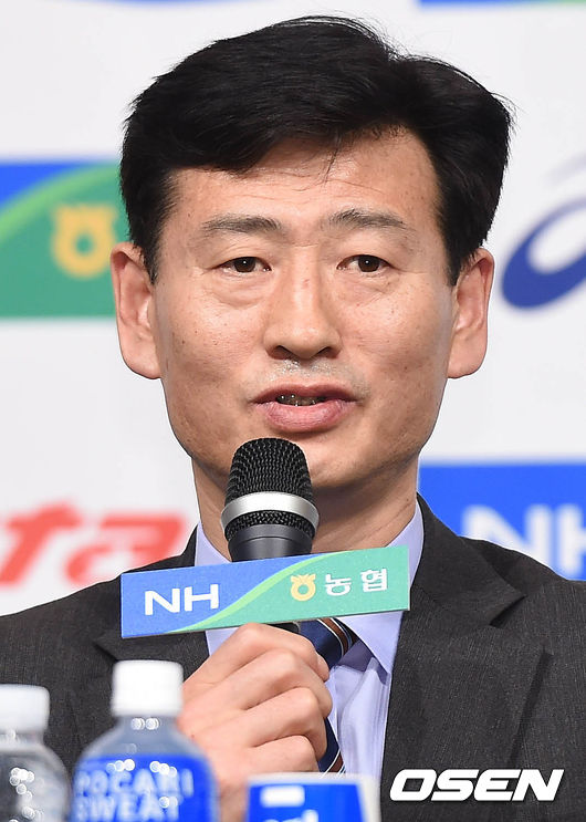 18일 오후 서울 청담동 호텔리베라에서 열린 NH농협 2014-2015 V-리그 포스트시즌 미디어데이에서 도로공사 서남원 감독이 질의응답 시간을 갖고 있다.