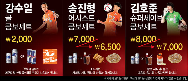 "강수일 골 주세요"라던가, "송진형 어시스트요"라고 하면 맛있는 음료와 간식거리가 나온다. 골 빼고 다 내주는 인심이 후한 '김호준 슈퍼세이브'도 있다. 선수들의 대표적인 이미지와 음식을 접목한 제주의 새로운 마케팅 전략이다.