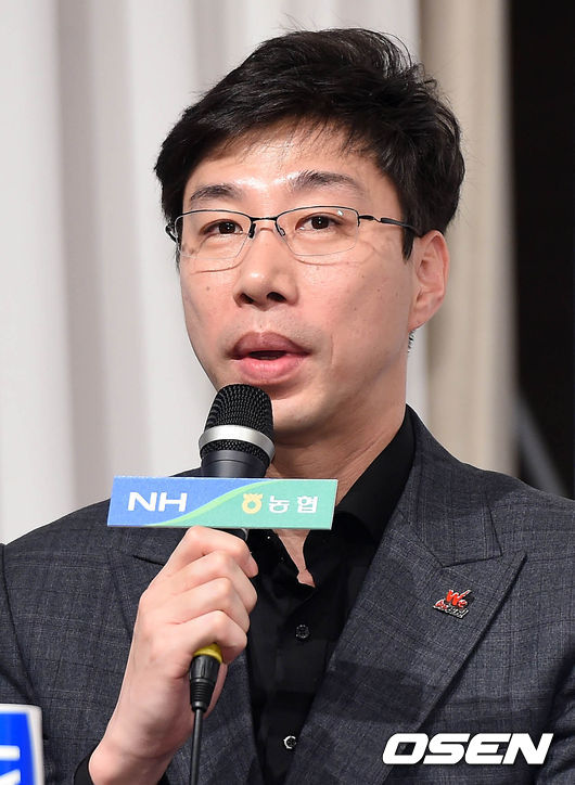 18일 오후 서울 청담동 호텔리베라에서 열린 NH농협 2014-2015 V-리그 포스트시즌 미디어데이에서 OK저축은행 김세진 감독이 질의응답 시간을 갖고 있다.