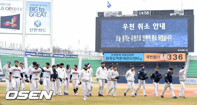 18일 서울 잠실야구장에서 '2015 타이어뱅크 KBO 리그 시범경기' 두산 베어스와 NC 다이노스의 경기, 스코어 5-5상황 우천으로 경기가 취소됐다.