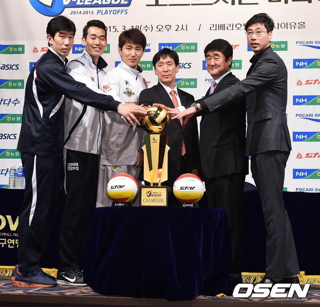 18일 오후 서울 청담동 호텔리베라에서 열린 NH농협 2014-2015 V-리그 포스트시즌 미디어데이에서 (왼쪽부터) 후인정, 고희진, 강영준, 신영철 감독, 신치용 감독, 김세진 감독이 포토타임을 갖고 있다.