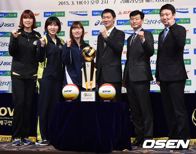 18일 오후 서울 청담동 호텔리베라에서 열린 NH농협 2014-2015 V-리그 포스트시즌 미디어데이에서 (왼쪽부터) 정대영, 염혜선, 남지연, 이정철 감독, 서남원 감독, 양철호 감독이 포토타임을 갖고 있다.