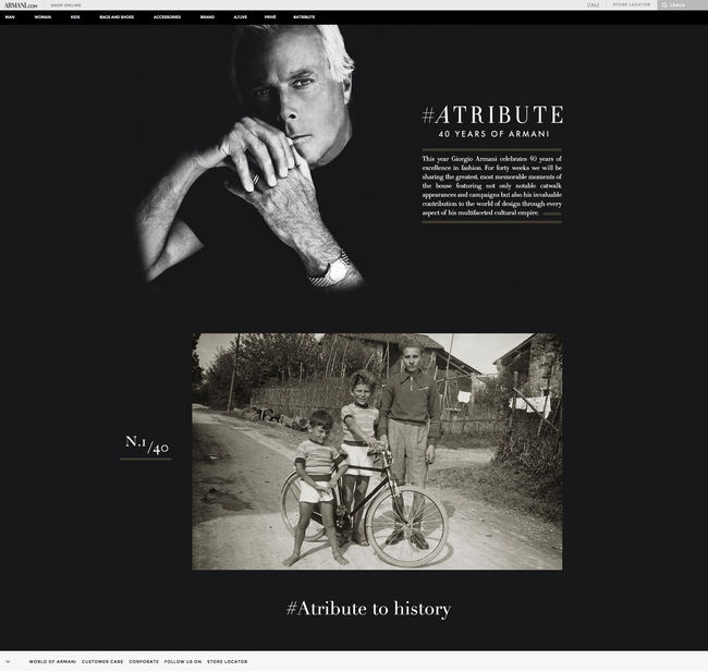 아르마니는 이달 16일부터 공식 웹사이트 www.armani.com/ATribute를 통해 디자이너 조르지오 아르마니의 40년간의 업적을 기념하는 다양한 스토리들을 공개한다.