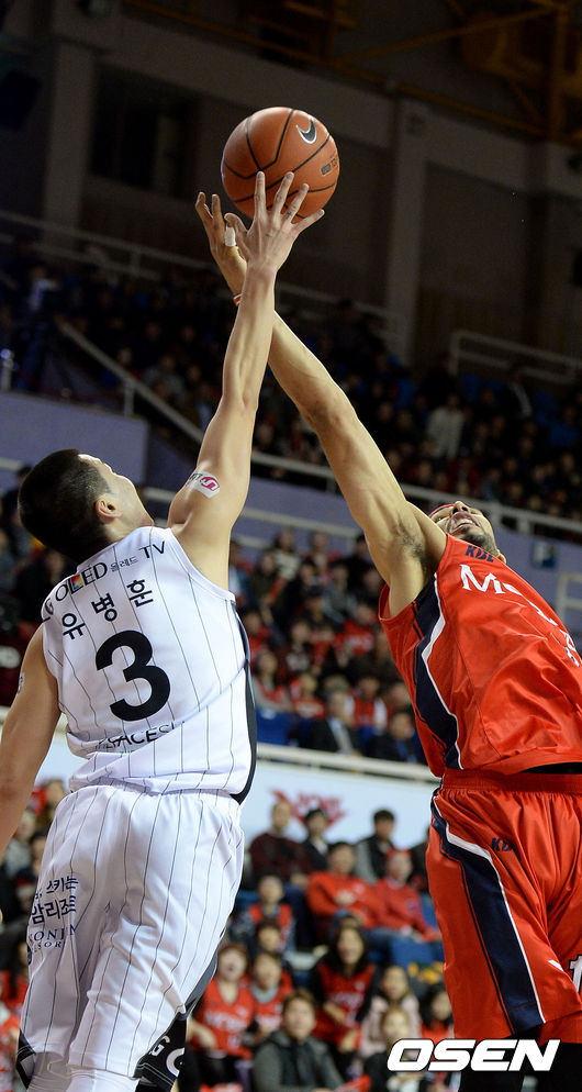 1쿼터 모비스 문태영과 LG 유병훈이 리바운드를 다투고 있다.