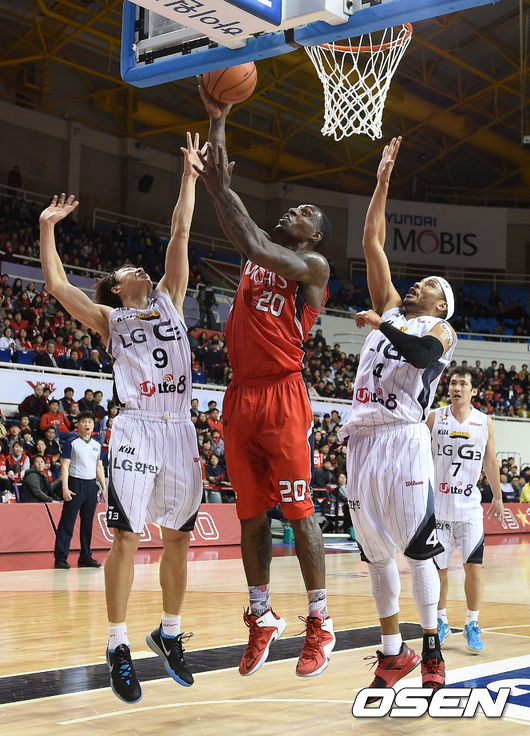 2쿼터 모비스 라틀리프가 LG 김영환, 문태종의 수비를 피해 슛을 성공시키고 있다.