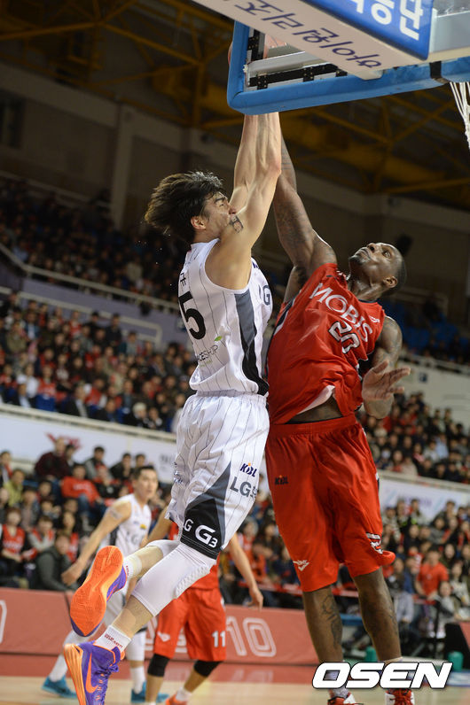4쿼터 LG 김종규의 덩크를 모비스 라틀리프가 파울로 막고 있다./jpnews@osen.co.kr