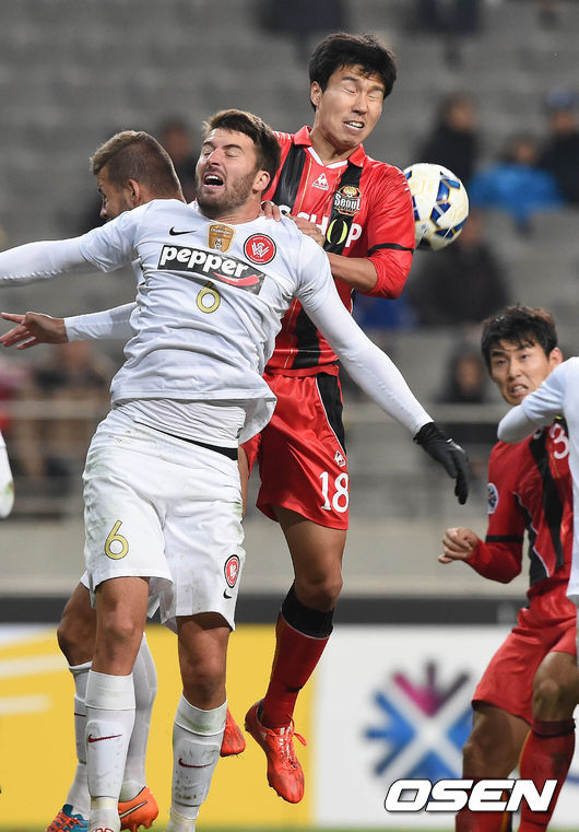 18일 오후 서울월드컵경기장에서 열린 2015 아시아축구연맹(AFC) 챔피언스리그 조별리그 H조 3차전 FC서울과 웨스턴 시드니의 경기 후반 김현성이 문전에서 헤딩을 시도하고 있다.