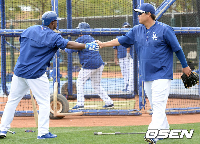 다저스 류현진이 푸이그와 하이파이브를 하고 있다.