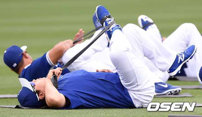 류현진이 스트레칭을 하고 있다.