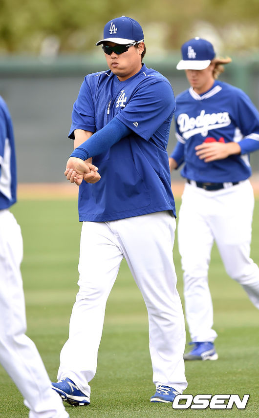 류현진이 스트레칭을 하고 있다.