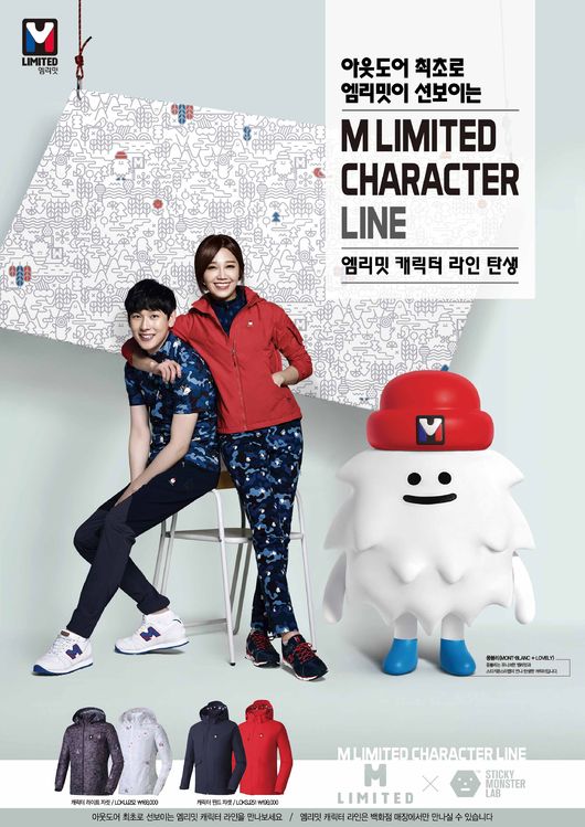 2535세대를 위한 메트로 아웃도어 브랜드 엠리밋(대표 한철호)이 디자인그룹 '스티키몬스터랩(Sticky Monster Lab)'과 협업해 2015 S/S(봄/여름) 시즌 아웃도어 최초로 '캐릭터 라인'을 출시했다.