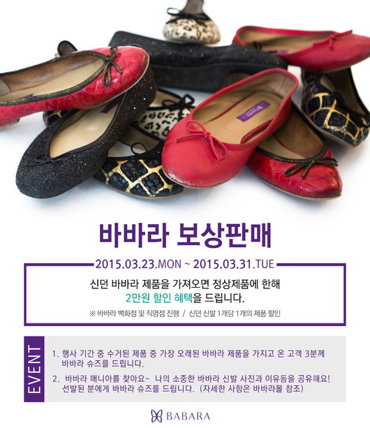 컨템포러리 슈즈 브랜드 ㈜바바라앤코 바바라(BABARA)에서 2015년 봄을 맞이하여 보상판매를 실시한다.