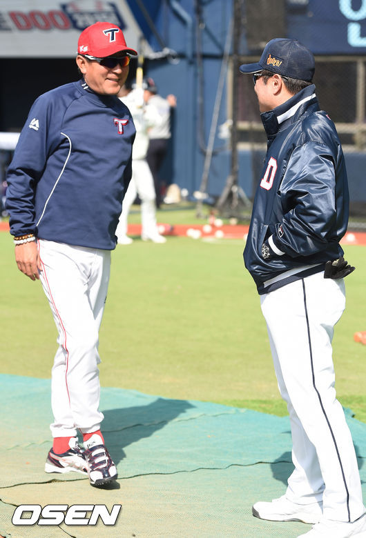 19일 오후 서울 잠실구장에서 열리는 '2015 KBO리그 시범경기' 두산 베어스와 KIA 타이거즈의 경기에 앞서 두산 김태형 감독과 KIA 김기태 감독이 인사를 나누고 있다.