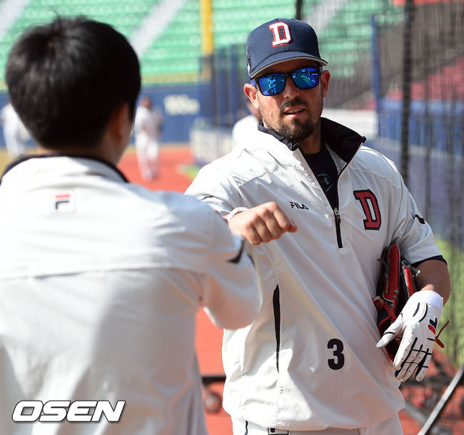 19일 오후 서울 잠실구장에서 열리는 '2015 KBO리그 시범경기' 두산 베어스와 KIA 타이거즈의 경기에 앞서 두산 루츠가 동료들과 하이파이브를 하고 있다.