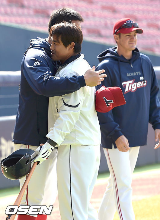 19일 오후 서울 잠실구장에서 열리는 '2015 KBO리그 시범경기' 두산 베어스와 KIA 타이거즈의 경기에 앞서 두산 홍성흔과 KIA 최희섭이 인사를 나누고 있다.