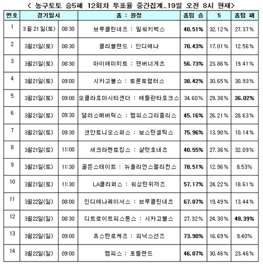 NBA 14경기 대상 농구토토 승5패 12회차 투표율 집계 결과
