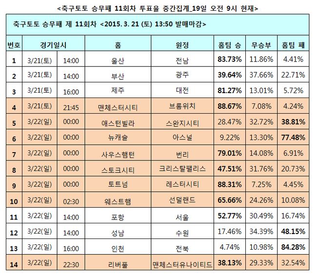 축구토토 승무패 11회차 투표율 중간집계 결과