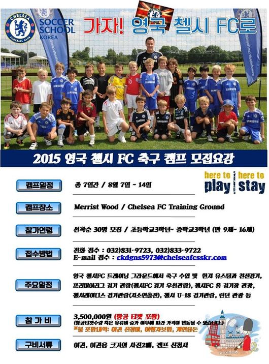 잉글리시 프리미어리그의 세계적인 명문 구단인 '첼시FC'가 인천 송도에 위치한 첼시축구학교와 함께 여름방학을 맞아 '2015 첼시FC 여름방학 축구캠프' 참가자를 모집한다.