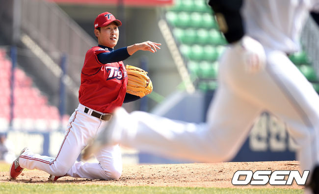 19일 오후 서울 잠실구장에서 열리는 '2015 KBO리그 시범경기' 두산 베어스와 KIA 타이거즈의 경기, 1회말 1사 두산 김재환의 강습 바운드타구를 잡은 KIA 선발투수 윤석민이 1루로 송구하고 있다.