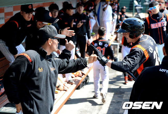 1회초 무사 만루에서 롯데 아두치가 최준석 타석에 폭투로 득점에 성공하며 이종운 감독과 하이파이브를 하고 있다. 아두치는 무사 1,2루에서 선취 1타점 적시타를 날렸다.