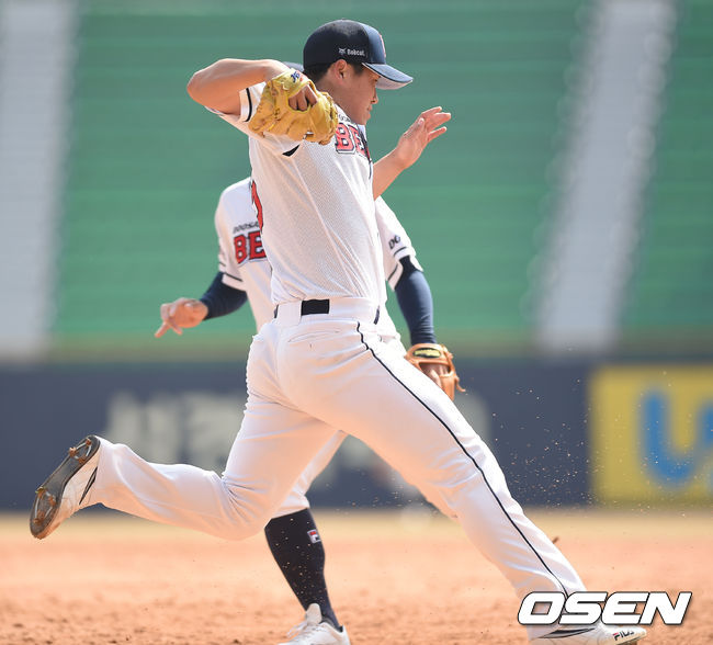 19일 오후 서울 잠실구장에서 열리는 '2015 KBO리그 시범경기' 두산 베어스와 KIA 타이거즈의 경기,5회초 KIA 선두타자 이인행의 내야땅볼때 두산 선발투수 진야곱이 베이스커버플레이를 펼치고 있다.