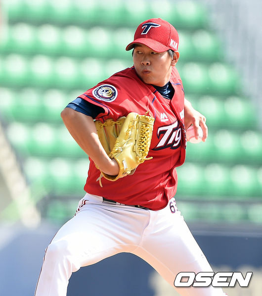 19일 오후 서울 잠실구장에서 열린 '2015 KBO리그 시범경기' 두산 베어스와 KIA 타이거즈의 경기, 5회말 KIA 임기준 투수가 역투하고 있다