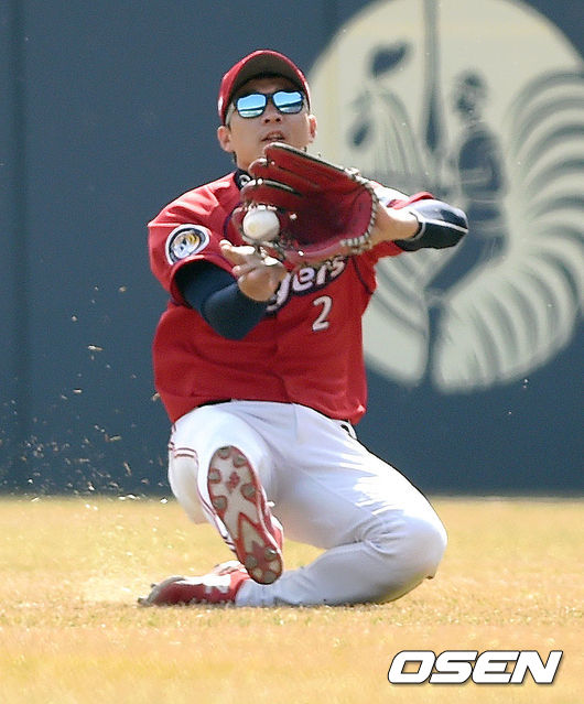 19일 오후 서울 잠실구장에서 열린 '2015 KBO리그 시범경기' 두산 베어스와 KIA 타이거즈의 경기, 6회말 2사 두산 정수빈의 타구를 KIA 신종길이 호수비 펼치며 잡아내고 있다.
