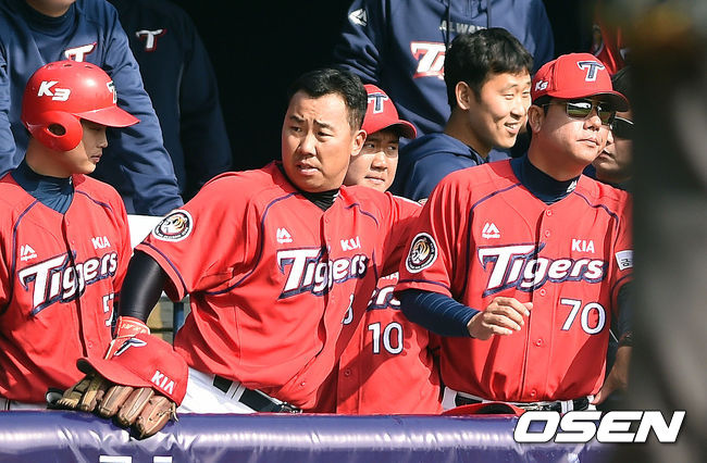 19일 오후 서울 잠실구장에서 열린 '2015 KBO리그 시범경기' 두산 베어스와 KIA 타이거즈의 경기,7회초 1사 1,3루 KIA 이범호가 역전 희생플라이를 날리고 동료들의 축하를 받고 있다