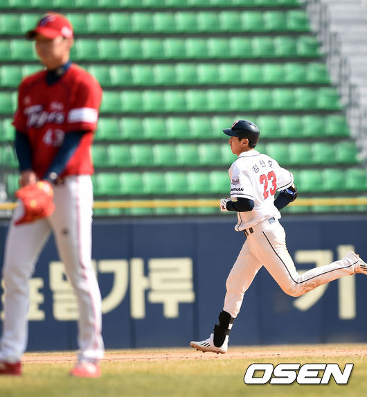19일 오후 서울 잠실구장에서 열린 '2015 KBO리그 시범경기' 두산 베어스와 KIA 타이거즈의 경기, 7회말 2사 두산 정진호가 동점 솔로홈런을 날리고 베이스를 돌고 있다