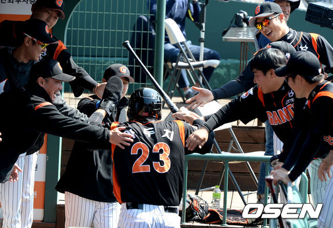 1회초 무사 만루에서 롯데 아두치가 최준석 타석에 폭투로 득점에 성공하며 더그아웃에서 동료선수들과 하이파이브를 하고 있다. 아두치는 무사 1,2루에서 선취 1타점 적시타를 날렸다.