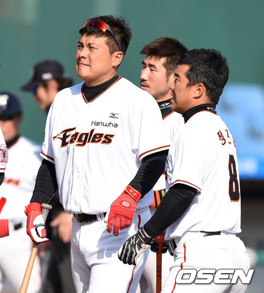 경기후 한화 김태균, 정근우를 비롯한 선수들이 팬들에 인사를 하고 있다. 김태균, 정근우는 이날 경기에 결장했다. /jpnews@osen.co.kr