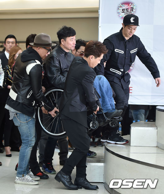 19일 오후 서울 영등포구 영등포동 타임스퀘어에서 진행된 토토즐 슈퍼콘서트 제작발표회에서 클론의 포토타임때 강원래가 동료 가수들의 도움으로 무대 위로 오르고 있다.