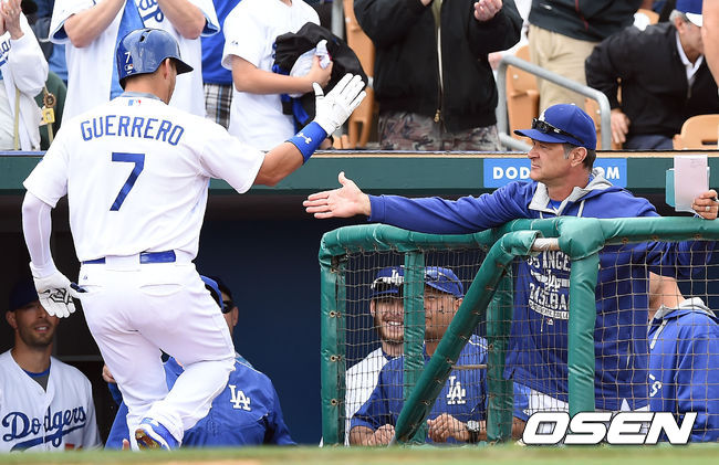 2회말 1사 1,2루 다저스 매팅리 감독이 3점 홈런을 때린 게레로와 하이파이브를 하고 있다.
