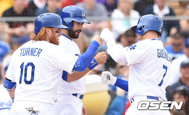 2회말 1사 1,2루 다저스 게레로가 3점 홈런을 날린 뒤 이디어, 터너와 하이파이브를 하고 있다.