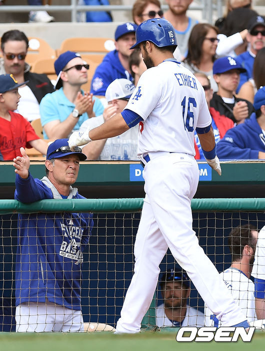 다저스 매팅리 감독이 교체되어 더그아웃으로 들어오는 이디어와 하이파이브를 하고 있다.