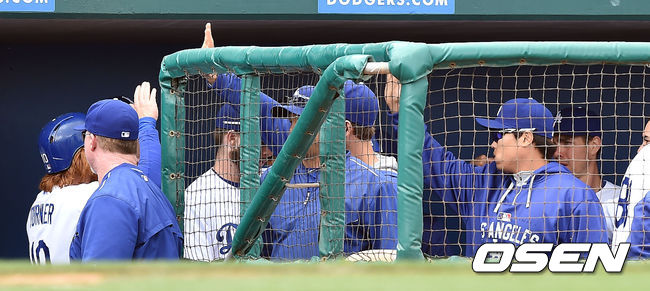 다저스 류현진이 2회말 1사 1,2루 다저스 게레로의 스리런 홈런때 동료들과 하이파이브를 하고 있다.