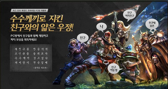 ‘수수께끼로 지킨 친구와의 얇은 우정’이라는 이름으로 열리는 이번 이벤트는 PC방에서 함께 LoL을 함께 즐기며 소통하는 재미를 더욱 많은 플레이어들과 나누기 위해 준비됐다.