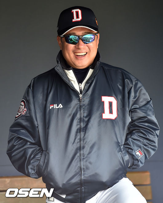 20일 오후 서울 잠실구장에서 '2015 KBO리그 시범경기' 두산 베어스와 KIA 타이거즈의 경기가 열릴 예정인 가운데 두산 김태형 감독이 덕아웃에서 환하게 웃고 있다.