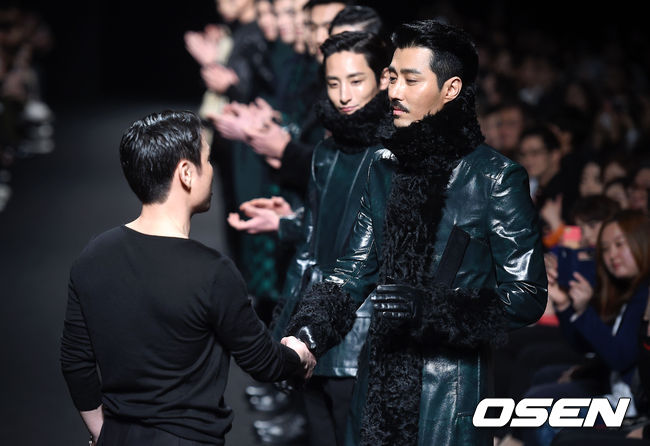 송지오 컬렉션 메인모델 차승원이 송지오 디자이너와 인사를 나누고 있다.