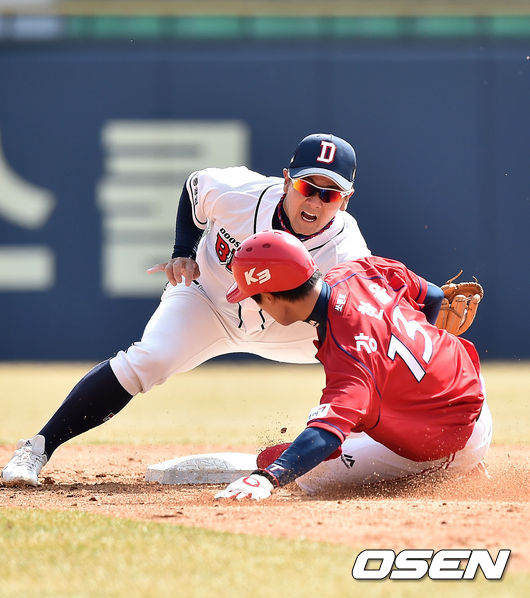 20일 오후 서울 잠실구장에서 열린 '2015 KBO리그 시범경기' 두산 베어스와 KIA 타이거즈의 경기, 3회초 1사 주자 1루 타석에 KIA 나지완 타석때 1루 주자 강한울이 2루 도루에 실패하고 있다.