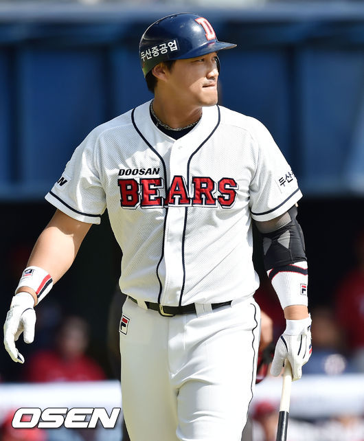 20일 오후 서울 잠실구장에서 열린 '2015 KBO리그 시범경기' 두산 베어스와 KIA 타이거즈의 경기, 4회말 1사 주자 2루 두산 홍성흔이 타석에서 삼진아웃을 당한 후 입술을 깨물고 있다.