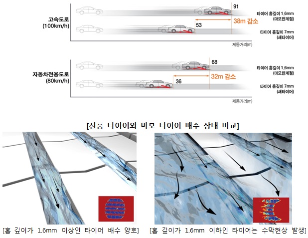 동일한 타이어 상황일지라도 비에 젖은 도로에서는 자동차의 제동력이 낮아져 미끄러지는 거리가 1.5배 이상 되는 점을 감안해 볼 때 타이어 마모와 제동거리와의 관계는 반드시 짚어봐야 한다.