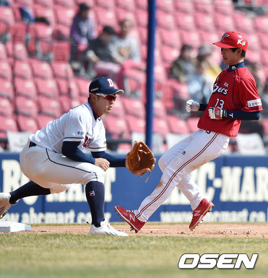 20일 오후 서울 잠실구장에서 열린 '2015 KBO리그 시범경기' 두산 베어스와 KIA 타이거즈의 경기, 5회초 1사 주자 1루 KIA 강한울이 선취 1타점 3루타를 날린 후 3루에서 세이프 되고 있다.