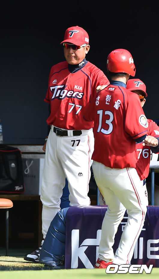 20일 오후 서울 잠실구장에서 열린 '2015 KBO리그 시범경기' 두산 베어스와 KIA 타이거즈의 경기, 5회초 1사 주자 3루 KIA 필의 2루수 땅볼 타구때 홈을 밟은 강한울이 김기태 감독과 하이파이브를 하고 있다.
