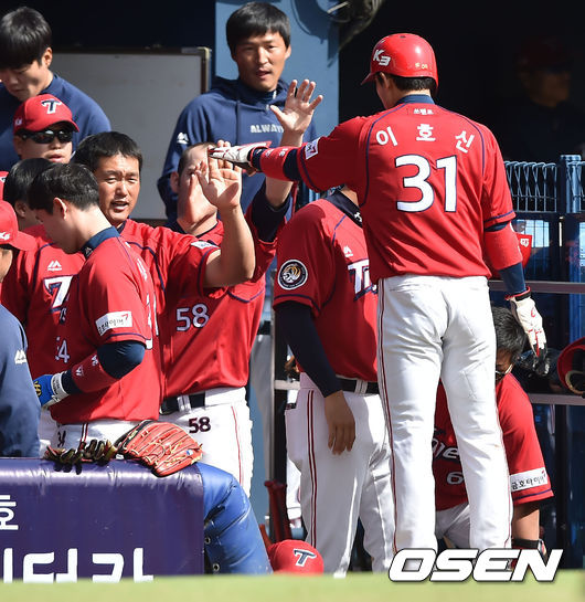 20일 오후 서울 잠실구장에서 열린 '2015 KBO리그 시범경기' 두산 베어스와 KIA 타이거즈의 경기, 5회초 1사 주자 1루 KIA 강한울의 선취 1타점 3루타때 홈을 밟은 이호신이 최희섭과 하이파이브를 하고 있다.
