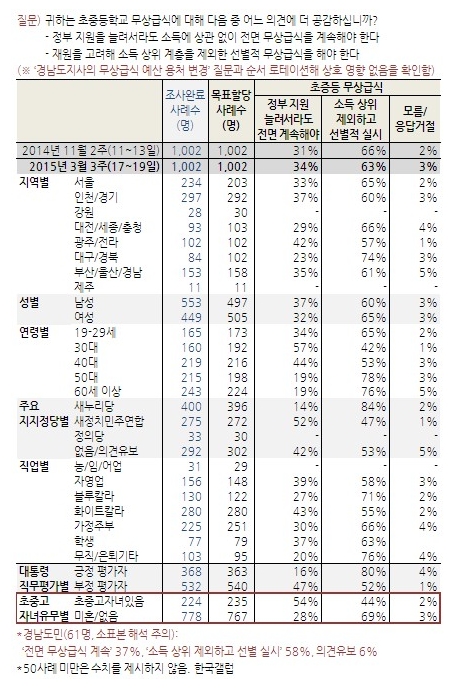 작년 11월 조사에서는 이들을 포함한 모든 응답자 특성별로 선별 실시 의견이 더 많았다. 그러나 이번 경남도의 무상급식 예산 지원 중단 결정에 관심이 집중되며 (잠재) 수혜자와 야권 지지층 중심으로 전면 무상급식 지지가 증가한 것으로 보인다.