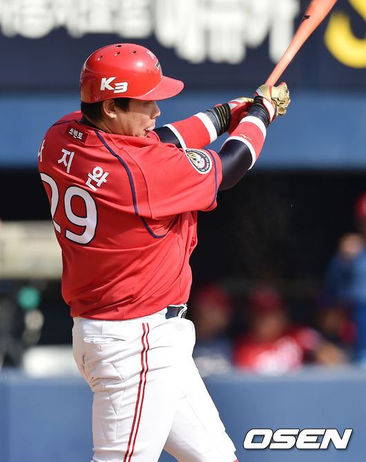 20일 오후 서울 잠실구장에서 열린 '2015 KBO리그 시범경기' 두산 베어스와 KIA 타이거즈의 경기, 8회초 KIA 선두타자 나지완이 좌중간 안타를 날리고 있다.