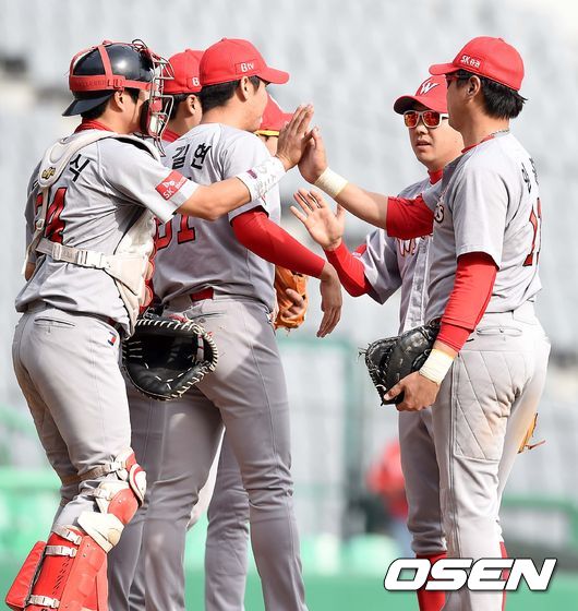 경기 종료 후 SK 선수들이 마운드에서 하이파이브를 나누고 있다./dreamer@osen.co.kr